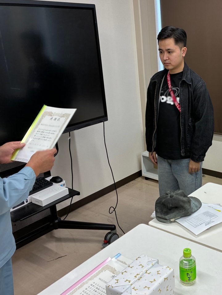 三年間の技能実習を全て修了し帰国間際の技能実習生たちに、工場長から感謝状が手渡されました。