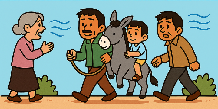 「子どもを歩かせて父親がロバに乗ってるなんて、なんて親だ!」