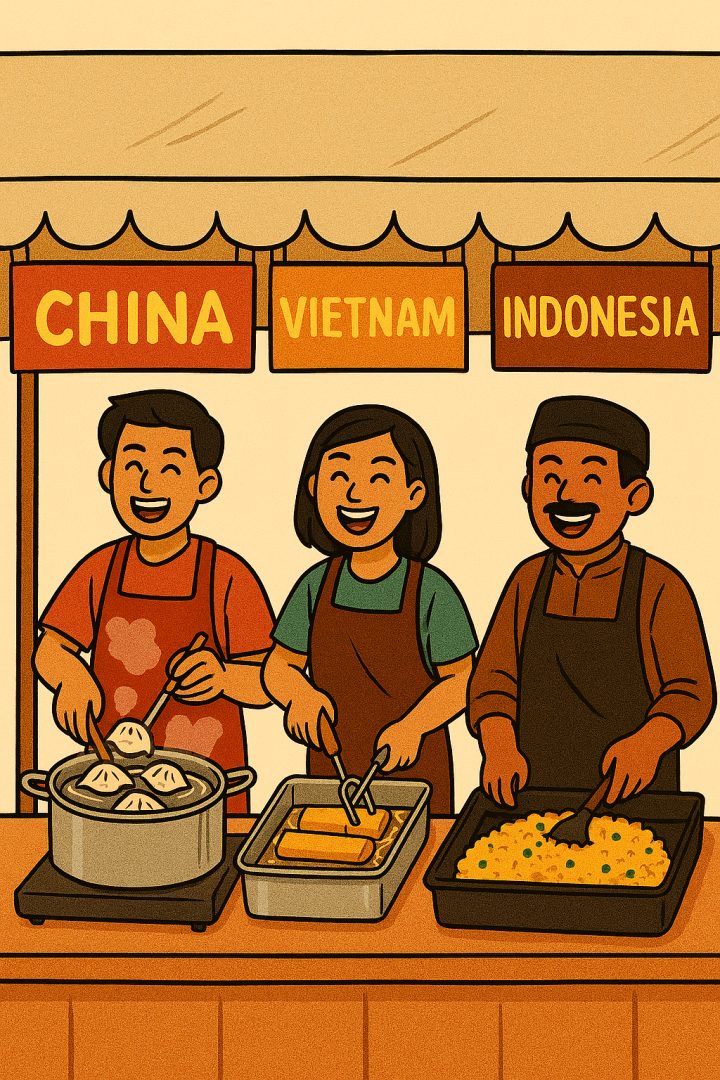 会社主催のお祭りやイベントで、実習生たちが自国の料理をふるまう光景もコロナ禍前はよく見られました。 中国人の実習生たちが大量の水餃子を包んでは茹でていたり、ベトナム人の実習生が揚げ春巻きを揚げていたり、インドネシア人の実習生が大きな鉄板でナシゴレンやミーゴレンを香ばしく炒めていたり。