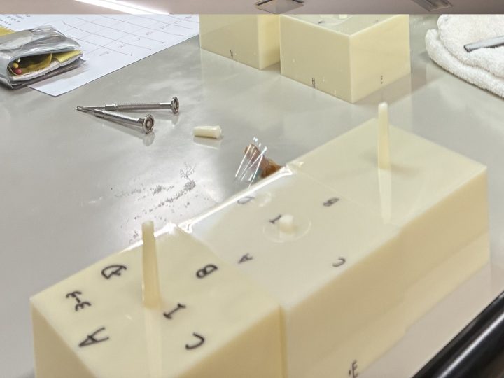 斬った後のサイズを測っています。使っているのはノギスという工具ですね。