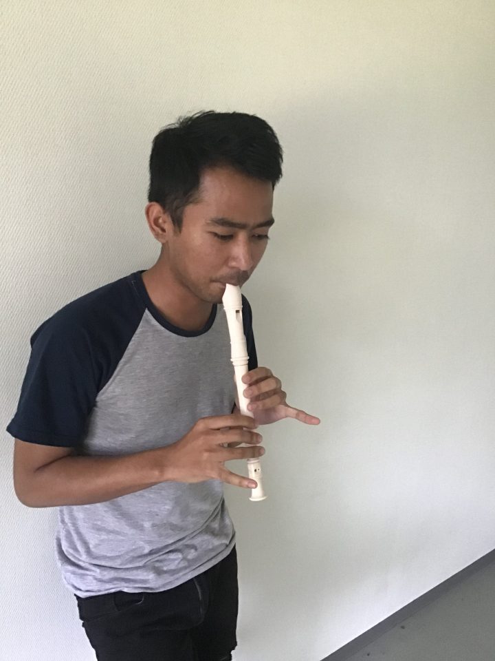 Hさんは笛を吹くのが好きで、インドネシアにいた時に独学で竹笛の吹き方を勉強して、吹けるようになったそうです。仕事が終わって寮に帰った後、このように好きな楽器で気分転換をしているそうです。